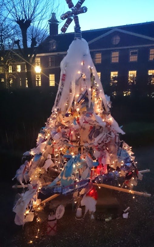Een eigen gemaakte 2 meter hoge boom van gerecycled materiaal verzameld door de kinderen, aangevuld met kistjes en lichtjes . Een mooie versiering voor op het schoolplein of in de hal tijdens de kerstperiode. De leerlingen werken met 2 of 3 groepen samen aan één boom.